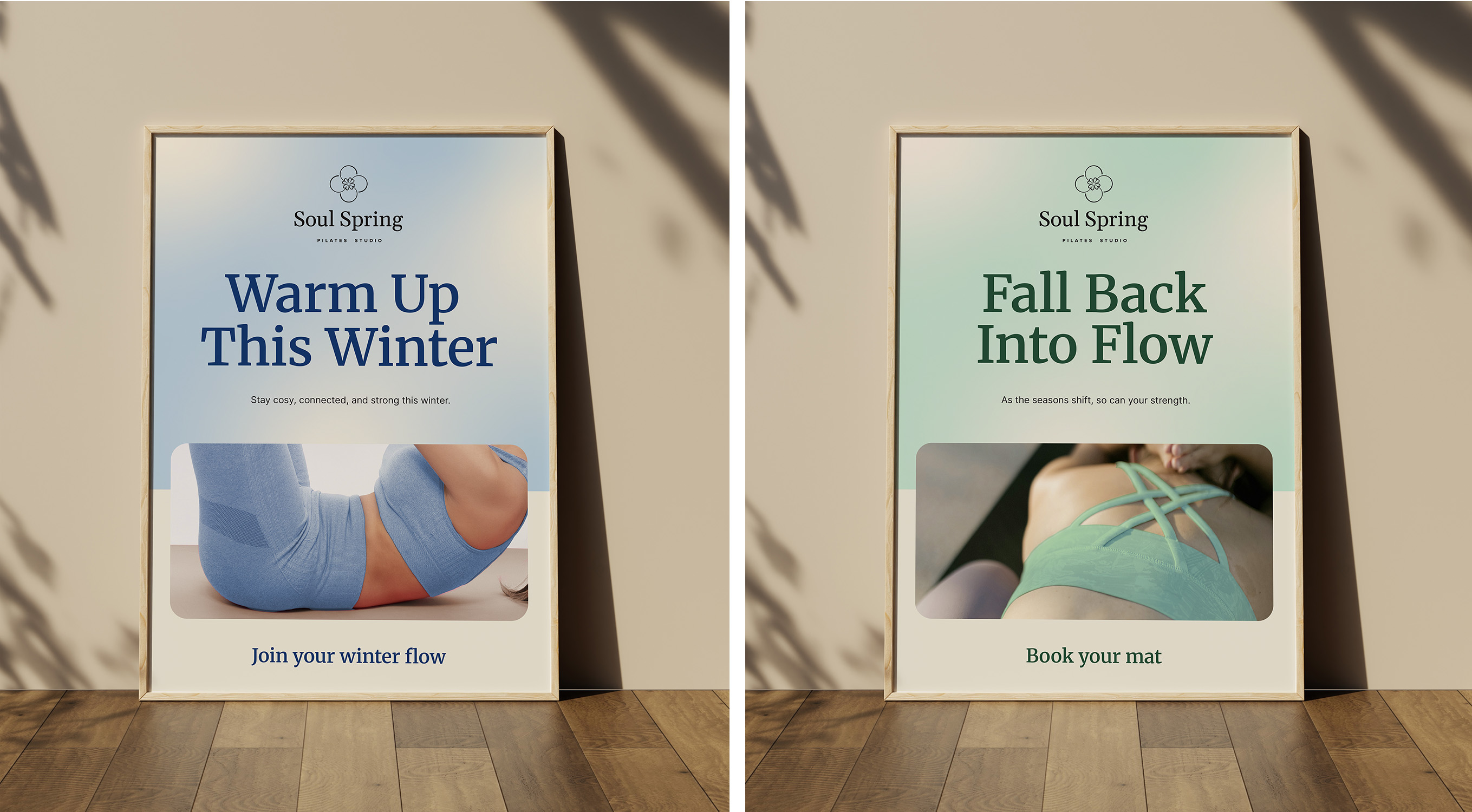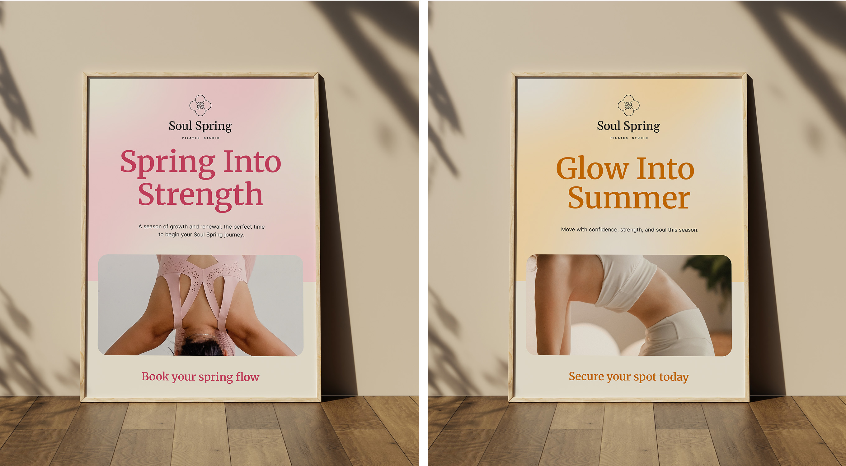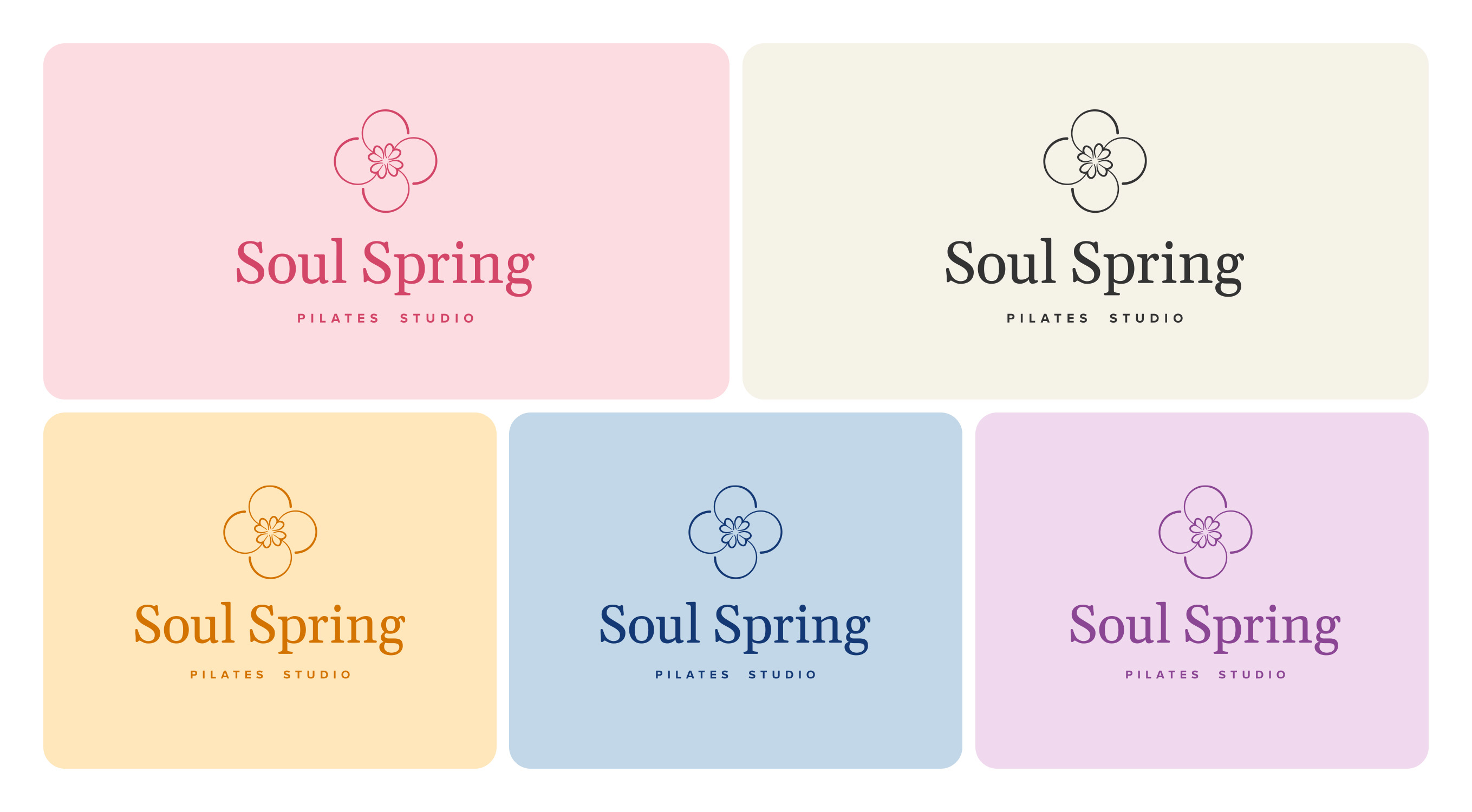 Through several iterations, we arrived at a clear direction. The brand needed to communicate sophistication, timeless design, and a sense of luxury wellness. Soul Spring would be positioned as a premium studio, but without feeling cold or exclusive. The pastel palette was key to bringing in joy, motivation, and a sense of community. Overall, the visual identity should feel youthful and optimistic — like fresh morning energy.